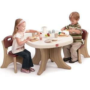 2 years & up. The unique "X" design legs provide superior durability and stability while . Includes table and two chairs. Chair holds maximum 75 lbs. Seat height 11". Minor assembly. Table: 20"H x 30"W x 30"D. Made in the USA.